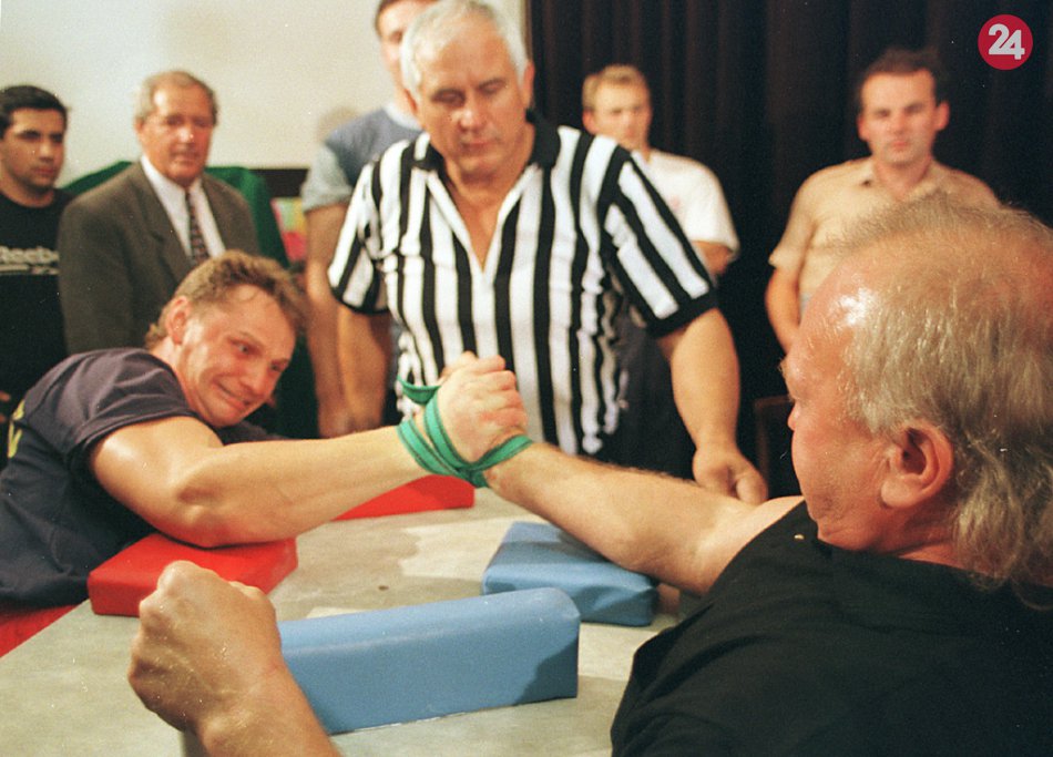 Súťaž v pretláčaní rukou Grand Prix Salamander 99. Na snímke súboj vo váhovej kategórii do 90 kg .